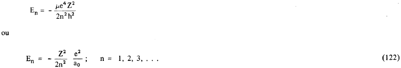 O número quântico principal n, não só define as possíveis funções radiais do átomo de hidrogênio, como também quantiza os valores permitidos da energia eletrônica. Isto pode ser visto através da equação (99) que define a energia eletrônica do hidrogênio, em função do número quântico principal. Fazendo uso de (99), nós então concluímos que a energia do elétron no átomo de hidrogênio, segundo a teoria de Schrödinger, é dada por