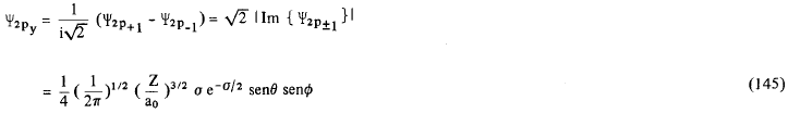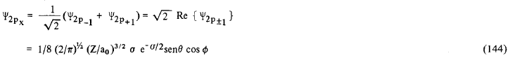 Através da equação (138) que define Ψnlm nós podemos notar que, com exceção dos casos em que m = 0, todas as funções hidrogênicas são complexas, isto é, possuem uma parte imaginária, não nula, Comumente, quando discutimos os problemas relacionados com estrutura atômica, molecular e ligações químicas, utilizamos funções hidrogênicas reais obtidas pela combinação linear destas funções complexas. Assim, para n = 2 e l = 1 podemos definir as funções reais Ψ2px, Ψ2py e Ψ2pz como