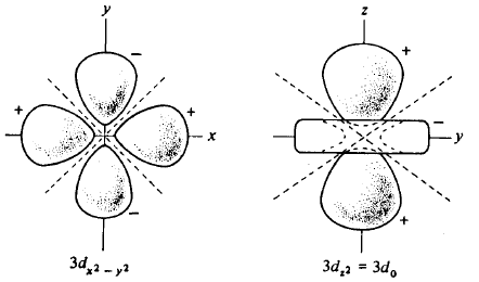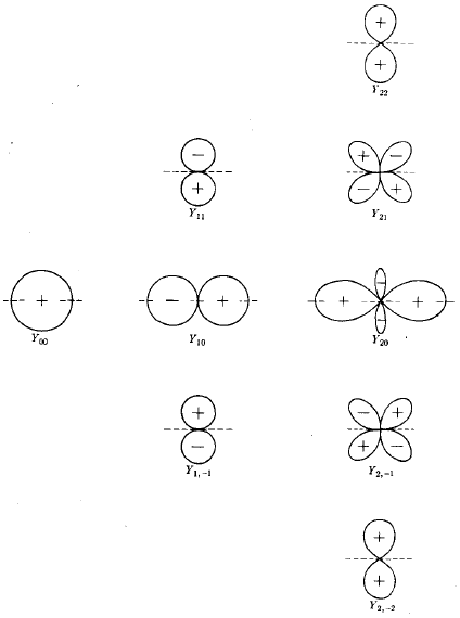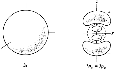 Fig. 5. Formato de alguns orbitais atômicos do átomo de hidrogênio. O orbital 2s tem um modo esférico que não aparece na figura; O orbital 3s tem dois destes modos. O orbital 3p, tem um modo esférico (indicado pela linha tracejada) e um plano modal (o plano xy). O orbital 3dz2 tem dois cones modais e o 3dx2-y2 tem dois planos modais. Na figura nós indicamos os sinais relativos de cada função de onda.