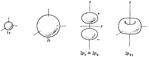 Agora que conhecemos a solução da Equação de Schrödinger para o átomo de hidrogênio, já estamos em condições de definir e estudar uma série de propriedades relacionadas com o mesmo. As funções de onda para o hidrogênio (ou para átomos ou íons atômicos com um único elétron) são definidas através de (138) fórmula geral para Ψnlm. Cada conjunto de n, l, m define uma função de onda, que por sua vez representa um dado estado eletrônico do átomo. Quando n é igual a um, nós dizemos que o elétron está na camada K. As camadas eletrônicas K, L, M, etc., correspondem respectivamente a n = 1,2,3 etc. As funções de onda de um único elétron são comumente chamadas de orbitais. Assim, não é correto referir-se a “orbitais de dois elétrons”. Orbitais correspondentes a l = 0, 1, 2, 3, 4, 5 etc, são conhecidos respectivamente, por orbitais s, p, d, f, g, h, etc., omitindo-se somente a letra j. Assim, a função de onda correspondente a n=2, l = 1, m = 0 é representada por Ψ2,1,0 ou simplesmente, função 2p. A designação destas letras (s, p, d, f, g, etc.) prende-se à terminologia inglesa utilizada por espectroscopistas que distinguiam linhas espectrais pelo seu aspecto, isto é, s → sharp, p → principal, d → difuse e f → fine. As outras foram sugeridas como extensão da nomenclatura, mantendo a ordem alfabética.
