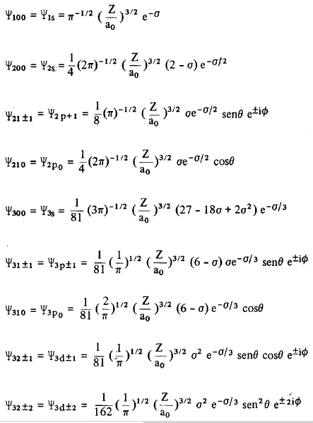 Tabela 1 - Funções de onda para o hidrogênio. Nestas equações σ = nρ / 2 = Zr/a0. Os sinais superiores e inferiores nos índices de Ψ devem corresponder respectivamente aos sinais superiores ou inferiores da parte exponencial das fórmulas. Neste caso, todos os índices positivos de Ψ correspondem a exp(imφ) e os negativos correspondem a exp(-imφ).